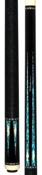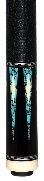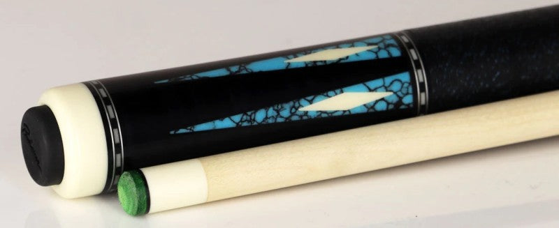 Introducing the Pechauer Pro Series P21-N Pool Cue: an ebony-stained Maple masterpiece with Turquoise points and Simulated Ivory diamonds. Its gorgeous, matching inlays adorn the butt sleeve, whilst a black with blue spec Irish linen wrap completes the look. Show off your passion for precision and style for the perfect shot.