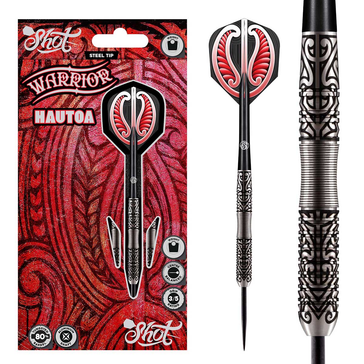 If bravery is half the battle, Hautoa - courageous and daring in Te Reo Māori - is your other half. This centre weighted, 80% tungsten barrel has a slim nose with a front shark fin grip. It's followed by a scalloped band, precision placed to give you perfect centre grip placement and pure confidence. Warrior Hautoa is adorned with cinder grip™ in a contemporary tribal tattoo design, which adds superfine traction and control in distinctive Shot Darts style. The source of your strength is also a challenge to play at your best. *Shafts supplied may vary from shown.