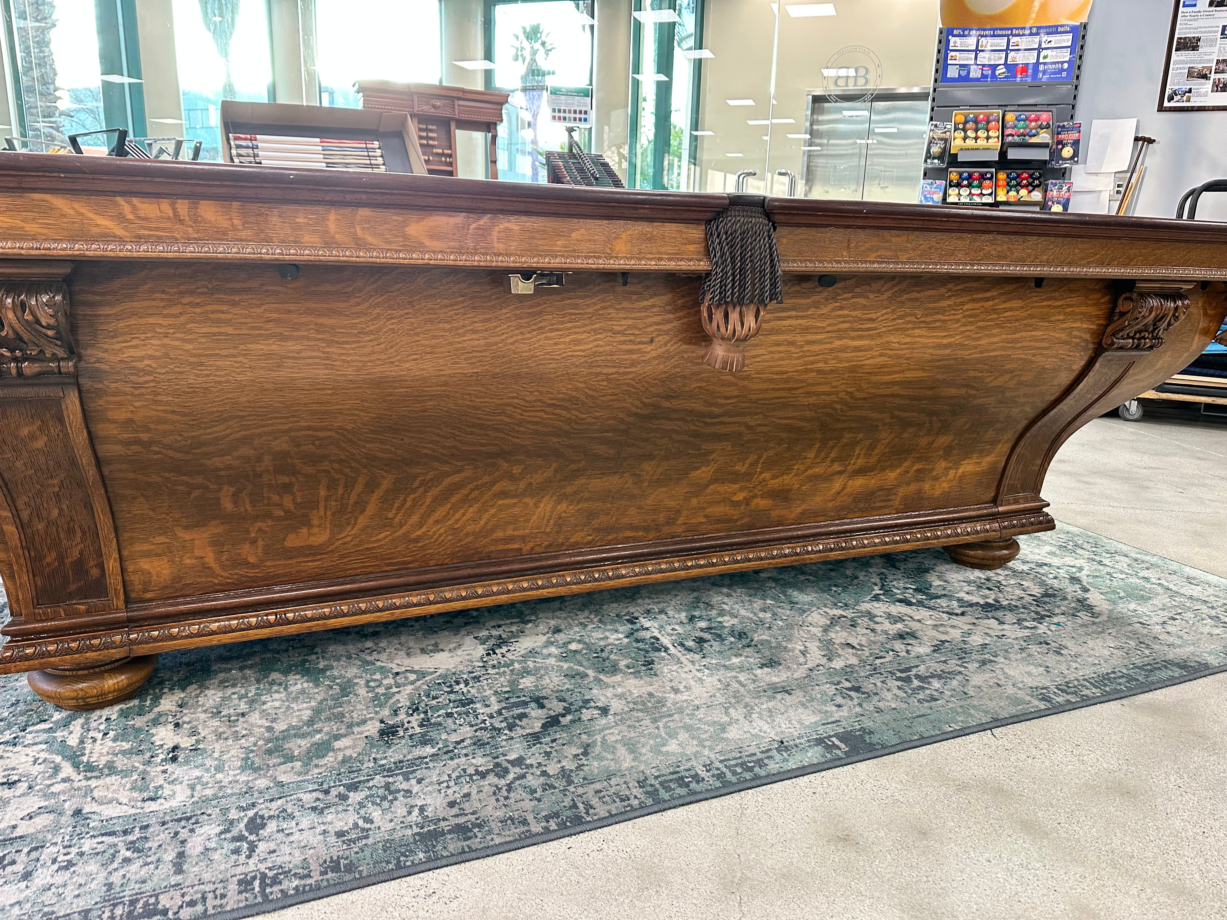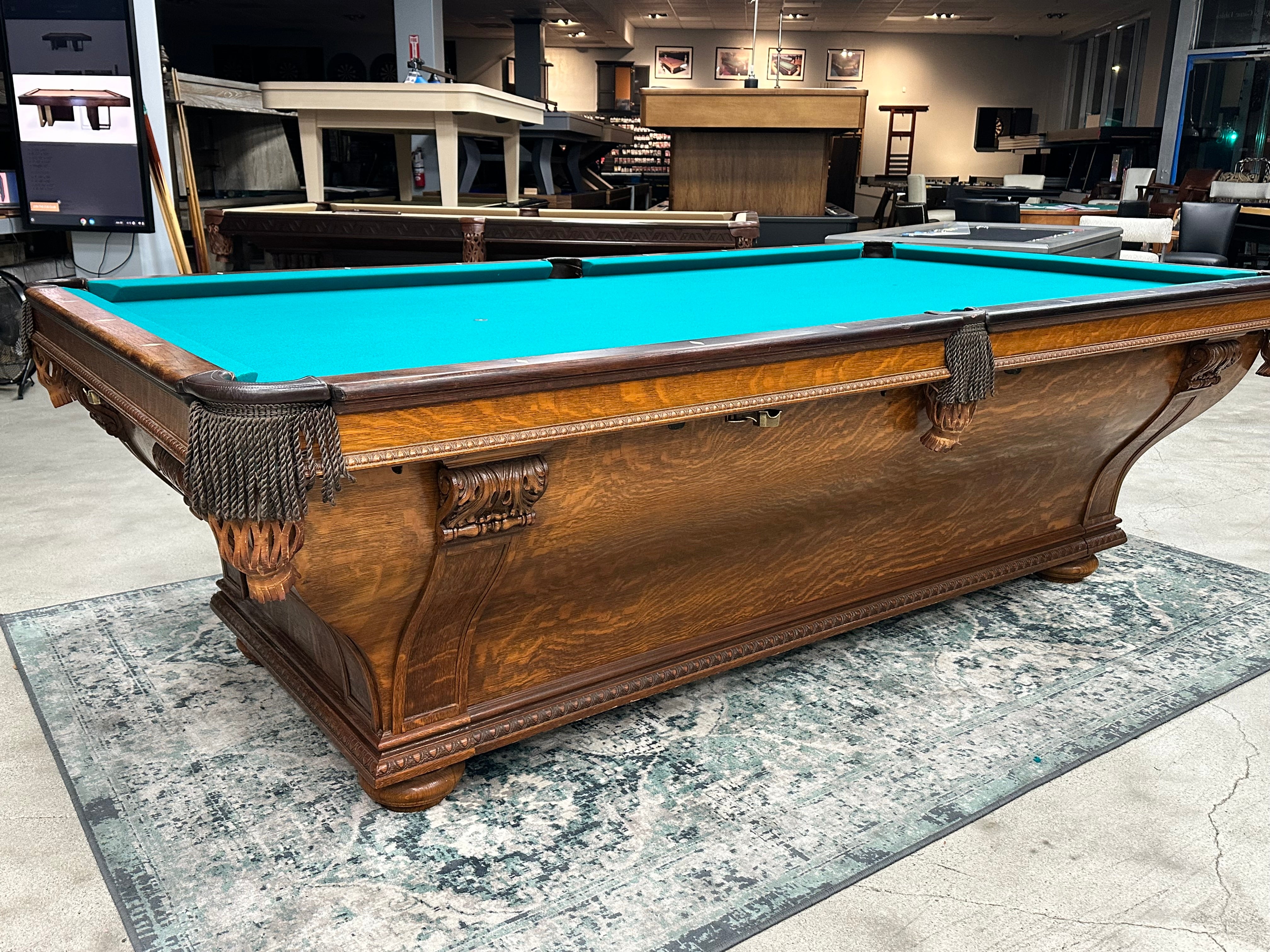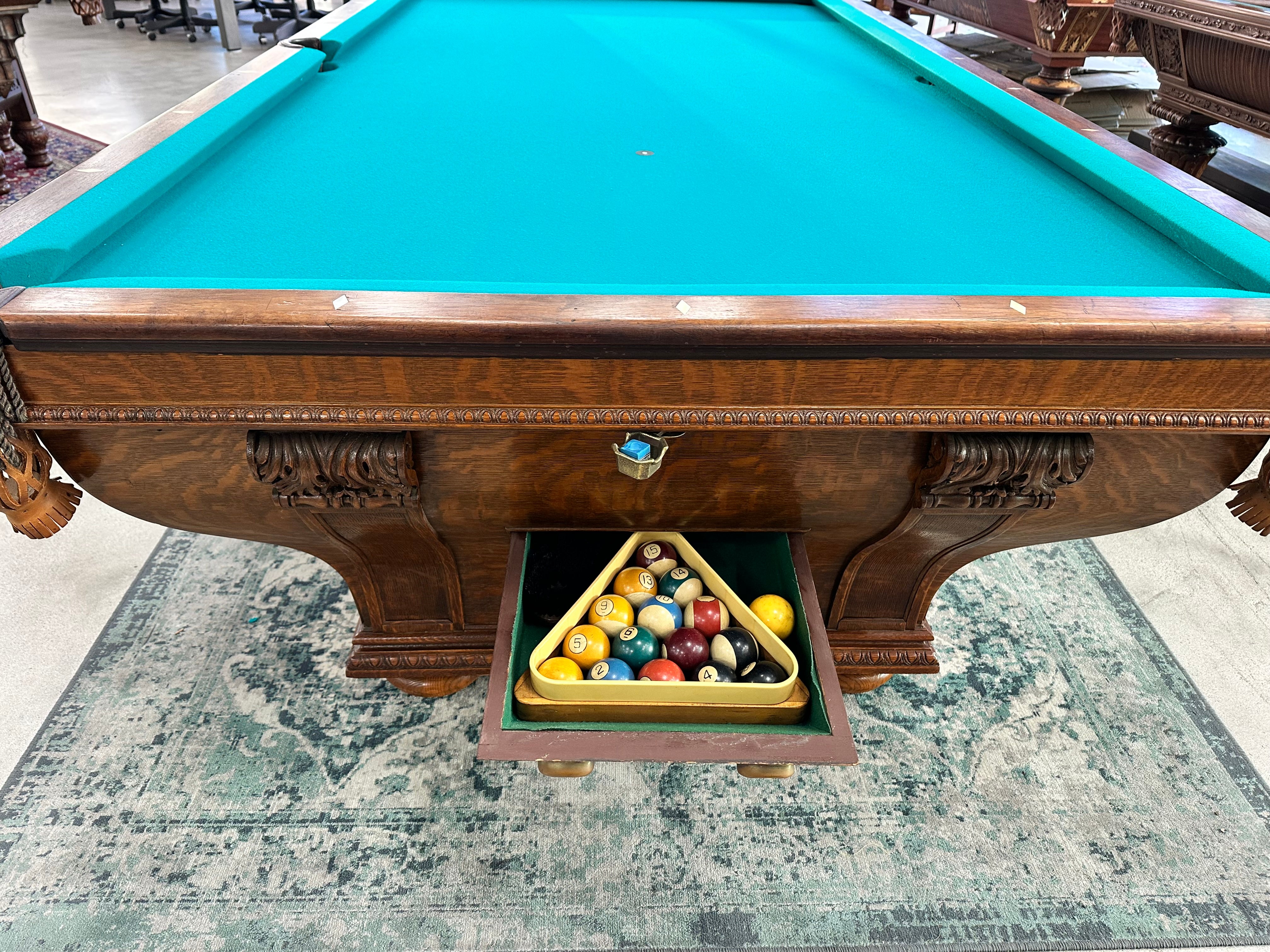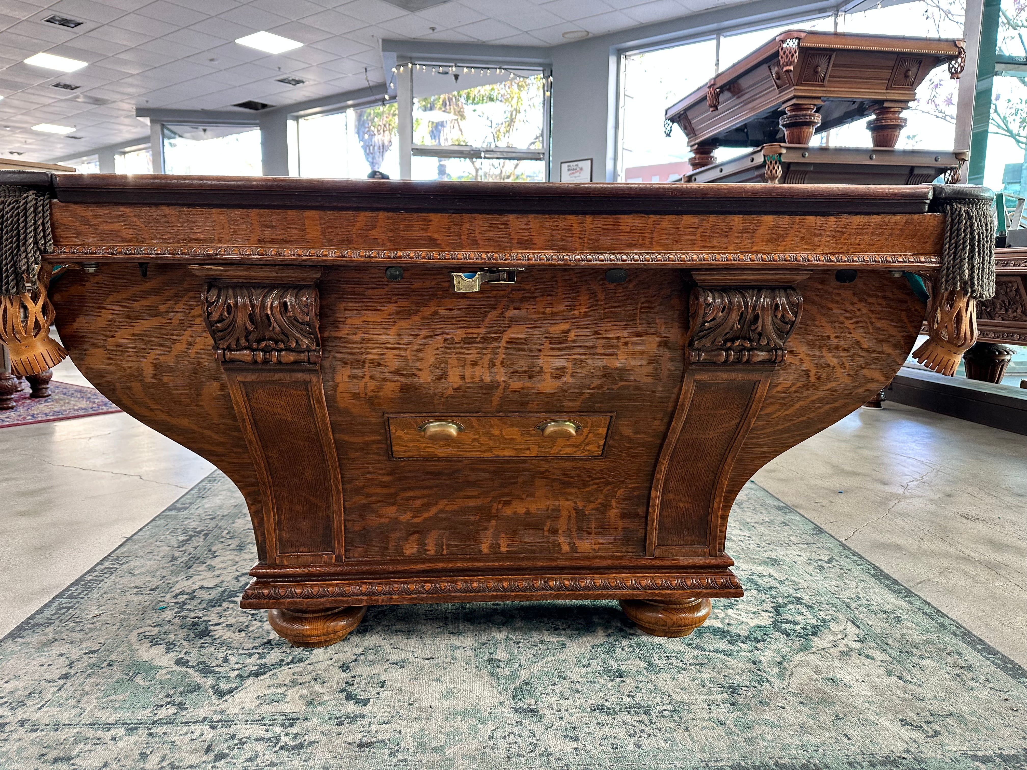 Rare cabinet model table that features two interchangeable sets of rails - one for traditional pocket billiards and one for no-pocket (carom) billiards - allowing you to easily convert the table for different styles of play. The thumb-screw rail system makes switching between configurations simple and efficient.