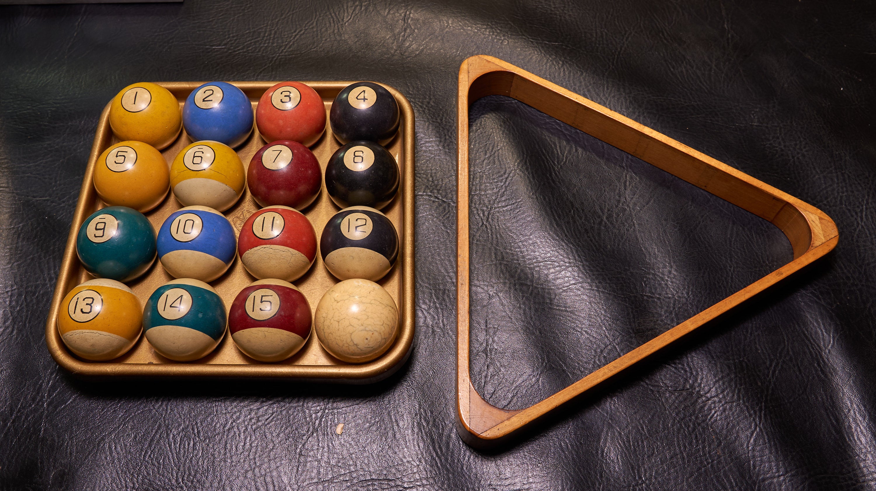 Sold as a package with a vintage set of clay balls, newer set of Brunswick Centennial Balls, a carom ball set, an older Brunswick logo triangle, brush, Brunswick chalk, a bridge stick with wooden bridgehead and 12 antique cues.