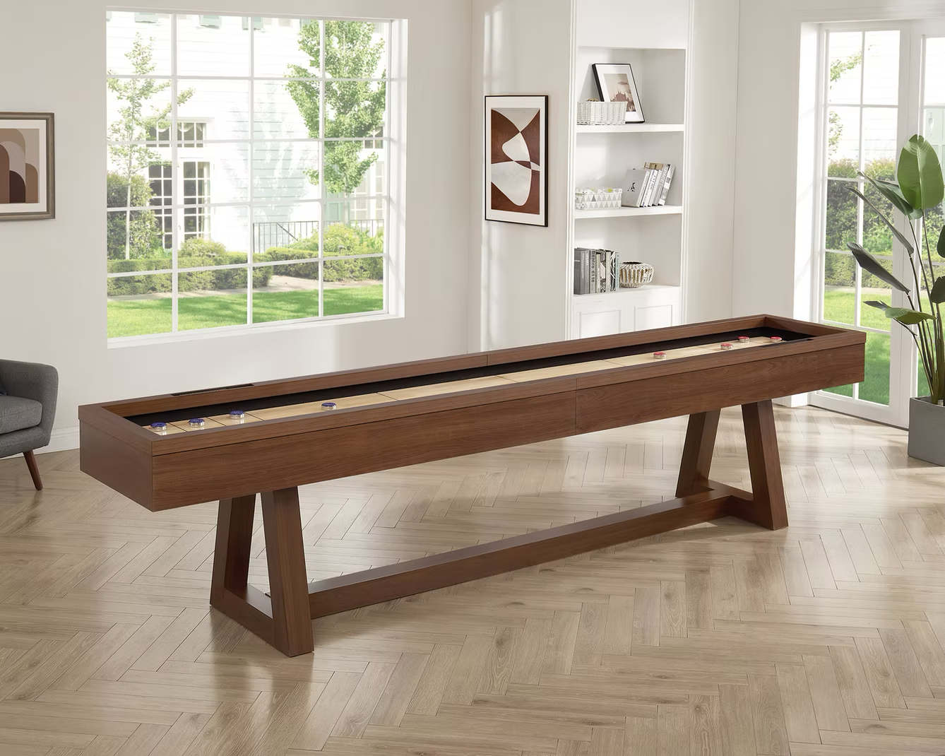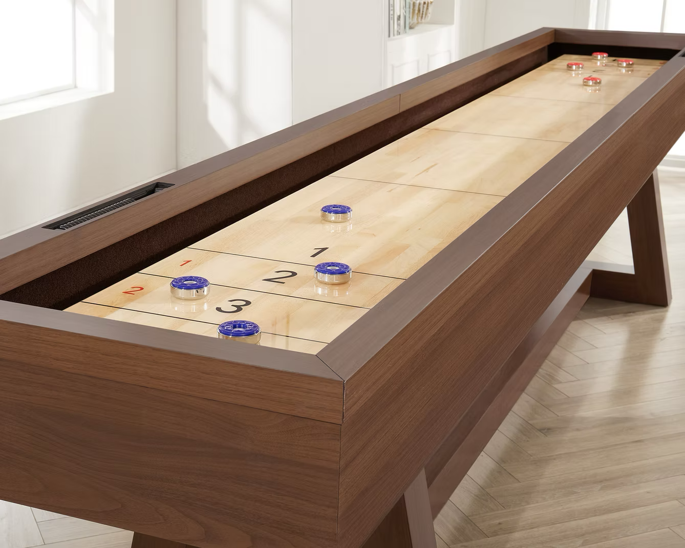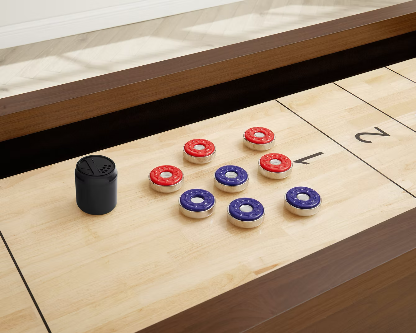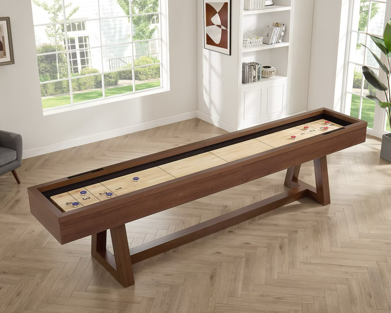 Introducing the 12' Aiden Shuffleboard Table – where elegance meets durability. Finished in a beautiful coffee color, this table is constructed from premium engineered wood and melamine board, supported by a sturdy 16" wide x 2-1/8" high rubber wood frame. The polymer-coated playfield ensures seamless gameplay, and the built-in climatic adjusters allow you to customize the playing surface. Designed for all skill levels, it features multiple scoring systems for both novice and advanced players. Complete with (8) ABS and chrome-plated steel pucks, the Aiden Shuffleboard Table offers a stylish centerpiece for any game room.