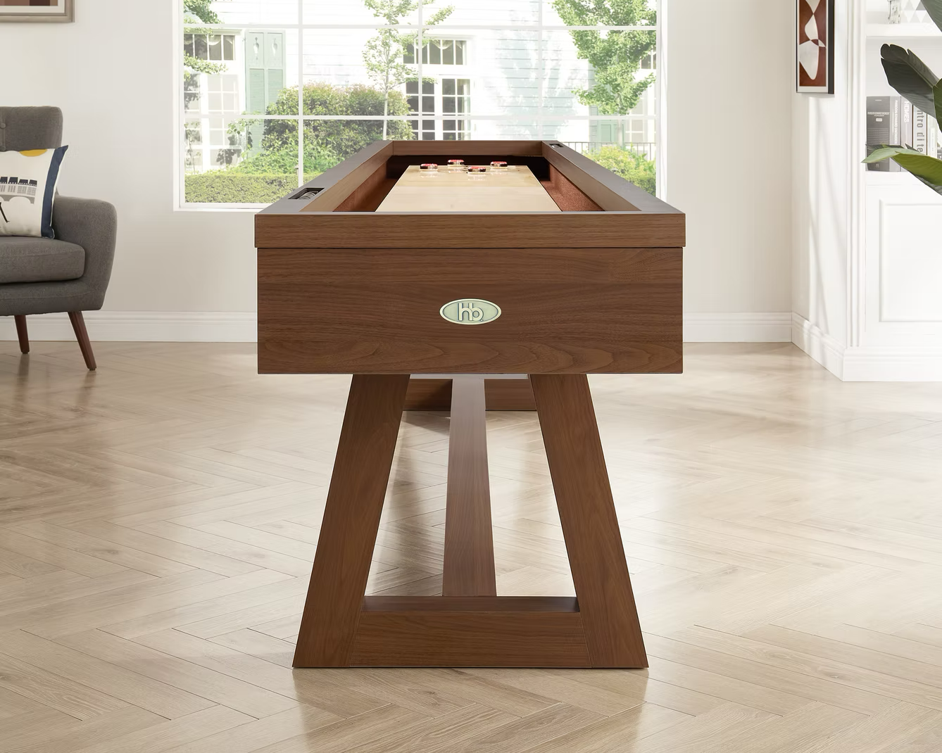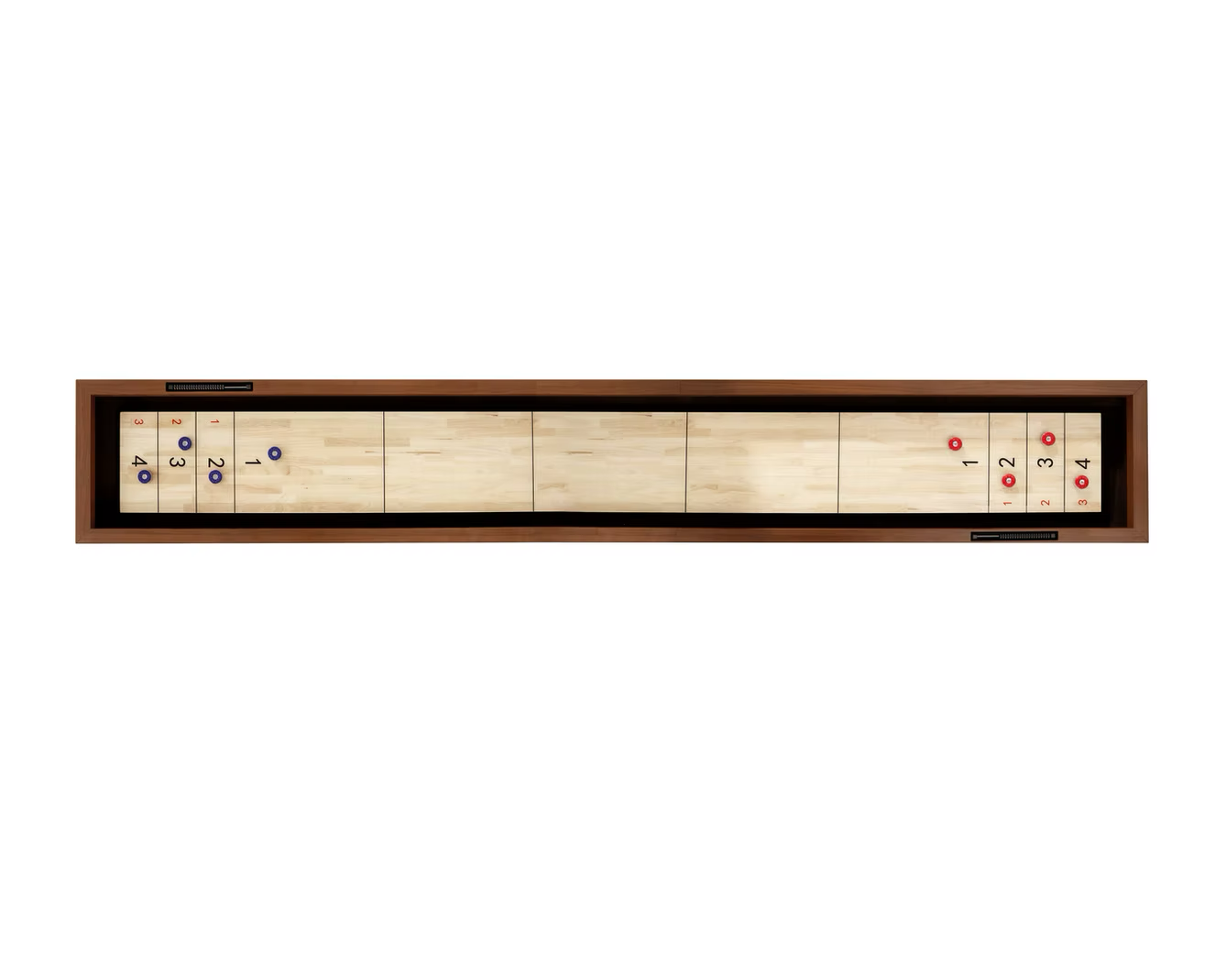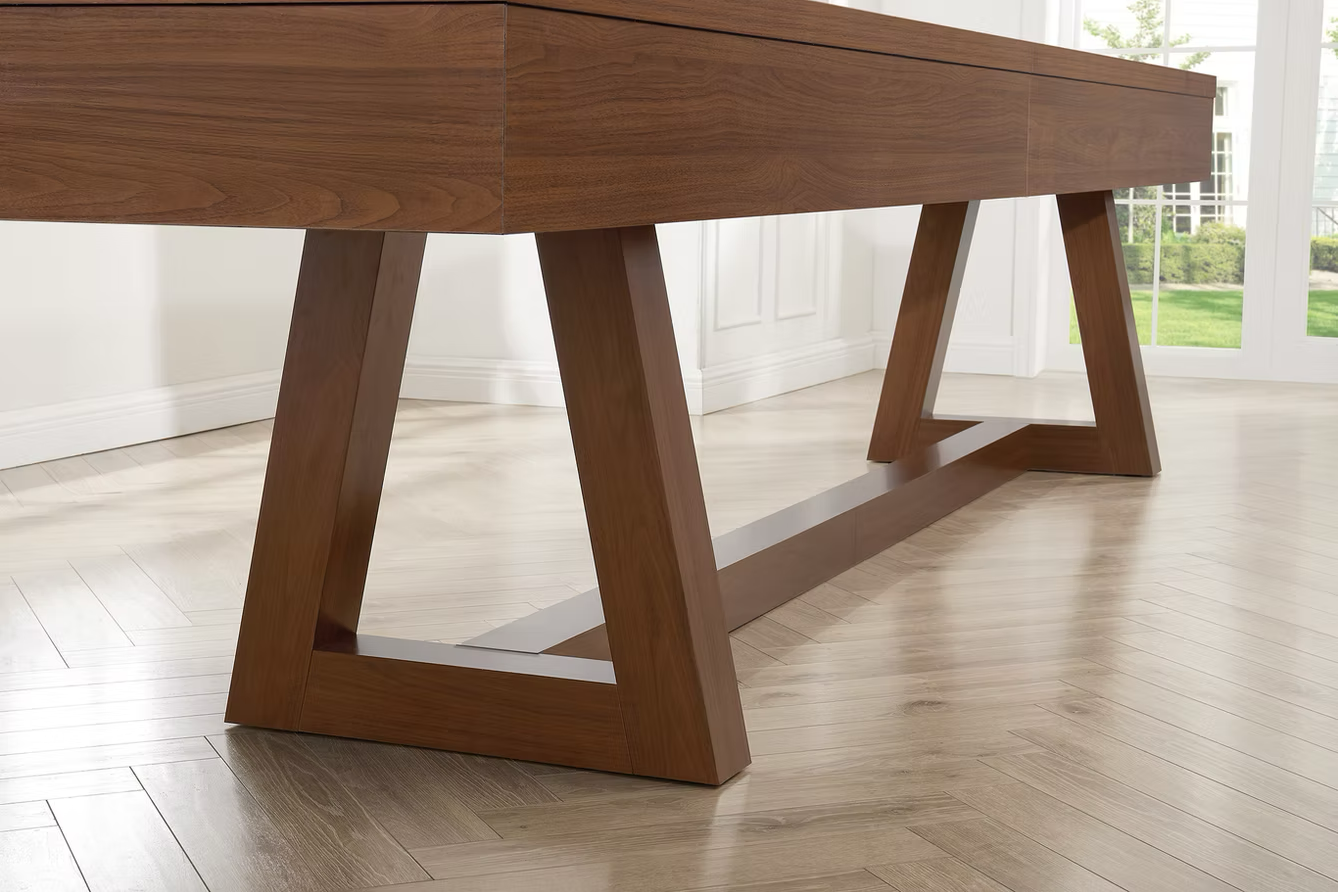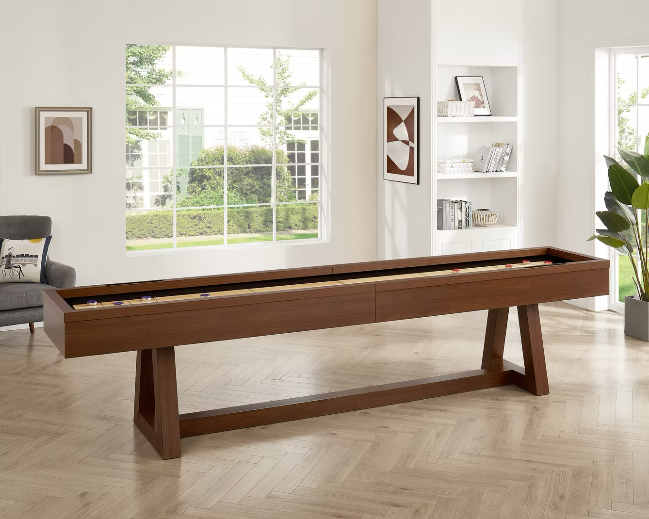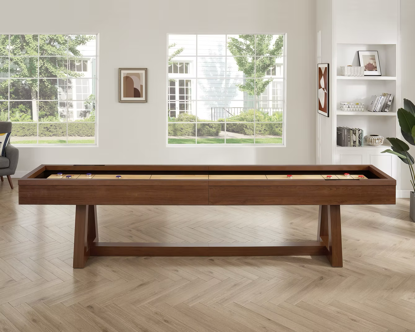 Introducing the 12' Aiden Shuffleboard Table – where elegance meets durability. Finished in a beautiful coffee color, this table is constructed from premium engineered wood and melamine board, supported by a sturdy 16" wide x 2-1/8" high rubber wood frame. The polymer-coated playfield ensures seamless gameplay, and the built-in climatic adjusters allow you to customize the playing surface. Designed for all skill levels, it features multiple scoring systems for both novice and advanced players. Complete with (8) ABS and chrome-plated steel pucks, the Aiden Shuffleboard Table offers a stylish centerpiece for any game room.