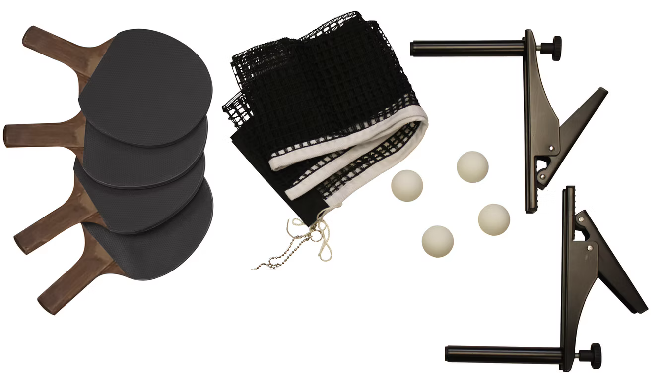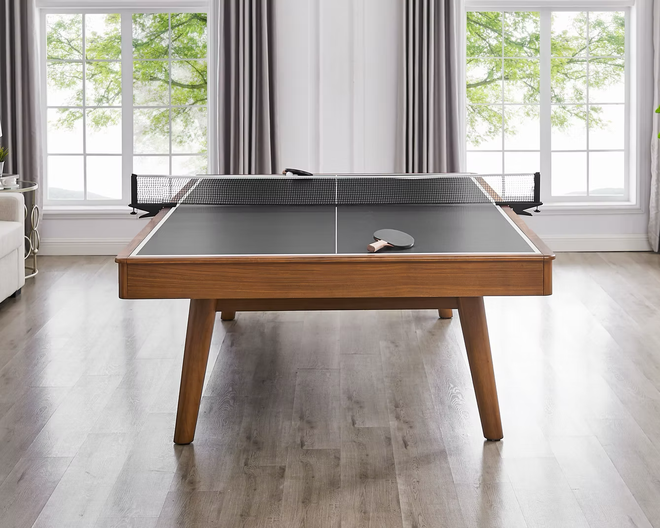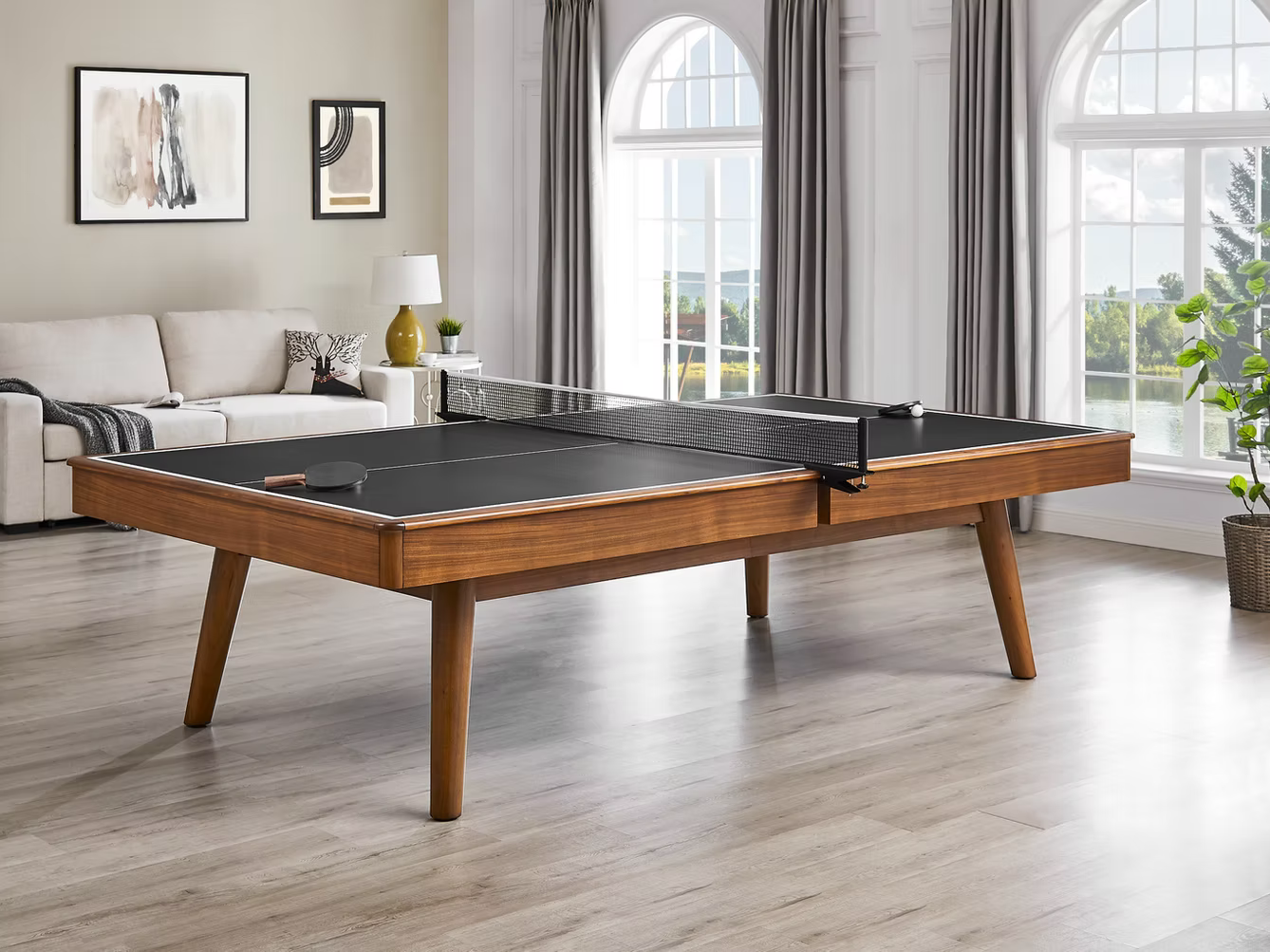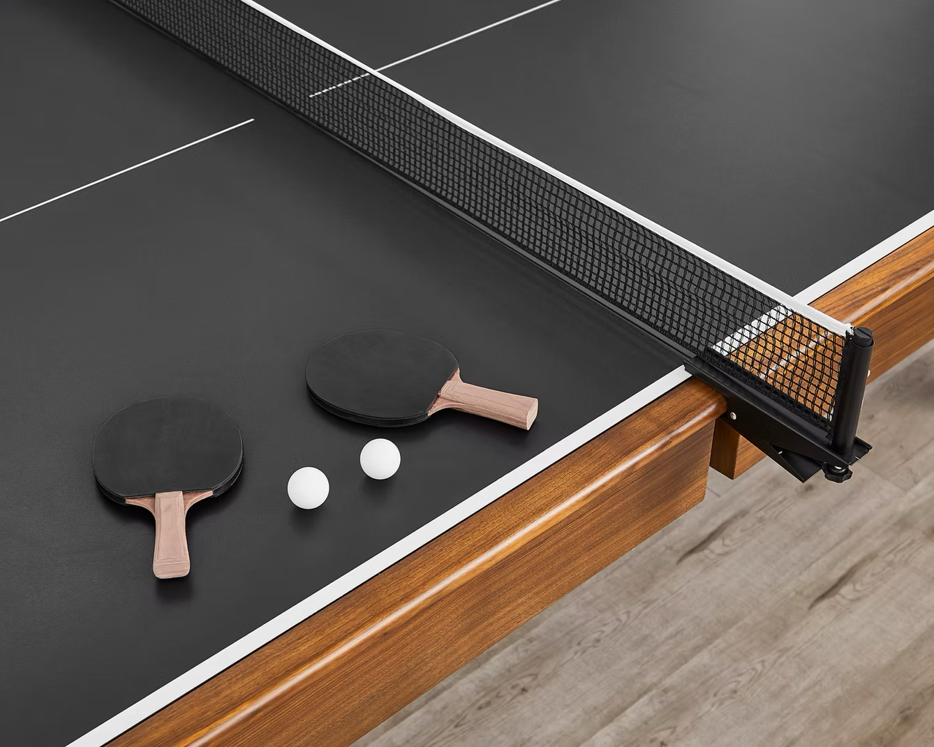 Spinning serves, lunging saves and everything else that is great about table tennis comes to life on this beautiful, mid-century table tennis that is sure to become a centerpiece of your game room. The black table tennis top is carefully inset into the walnut mist colored wood frame to provide years and years of high quality game play on this gorgeous family heirloom. Adjustable leg levelers ensure a level surface so that all you have to worry about is getting the ball over the net.