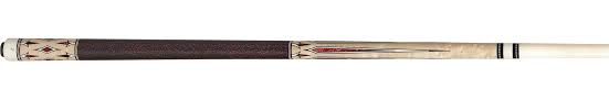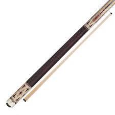 No stain figured maple cue with ebony and sim ivory framed red pearl points and inlays. Black and red Irish linen wrap