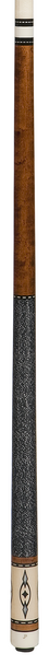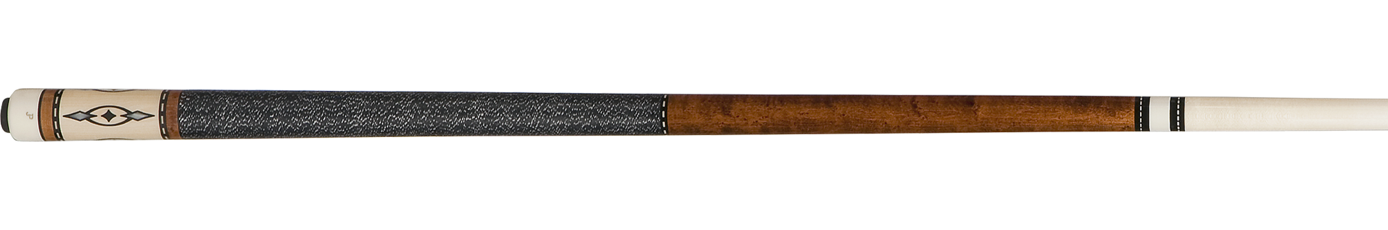 • Chestnut-stained figured maple cue with ebony and pearl diamond inlays. Black and white Irish linen wrap.