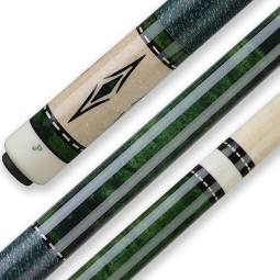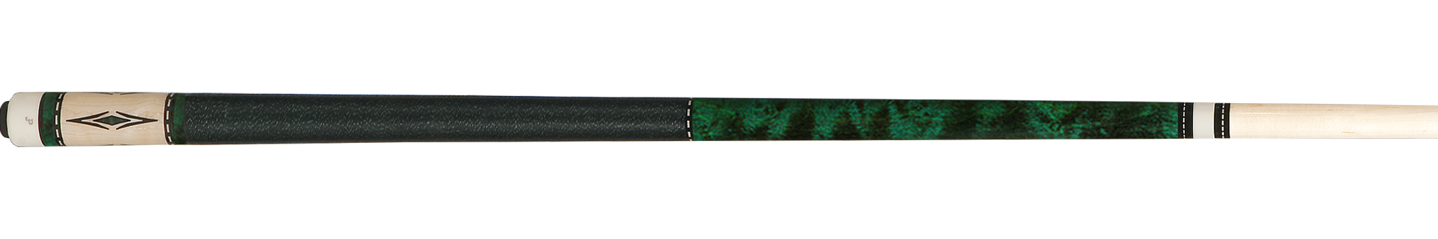 • Green-stained figured maple cue with ebony and green pearl inlays. Black and green Irish linen wrap.