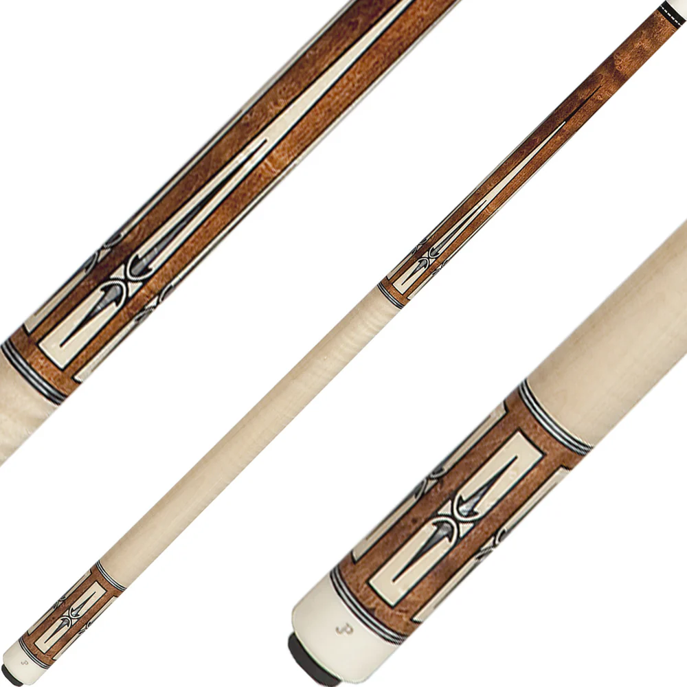 Chestnut-stained figured maple cue with ebony framed maple and pearl points and inlays. No stain maple wrap.