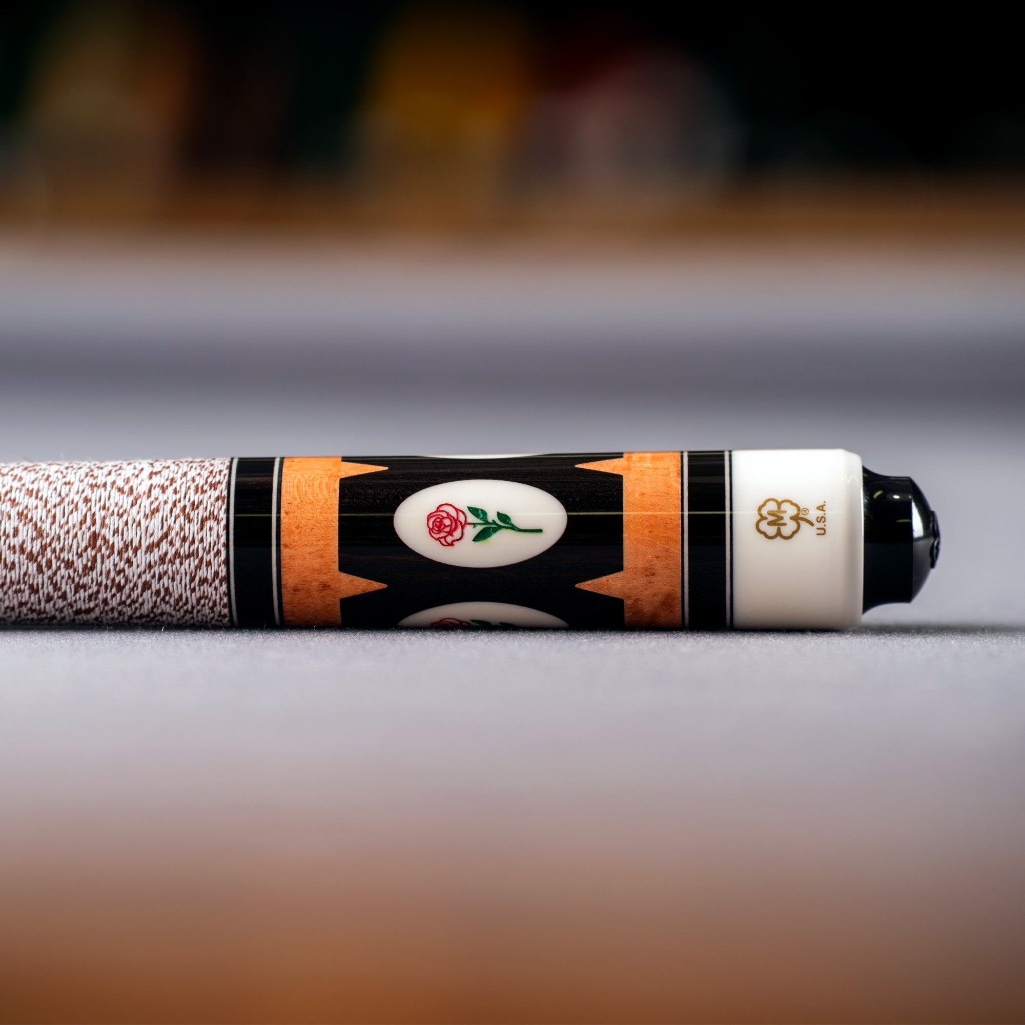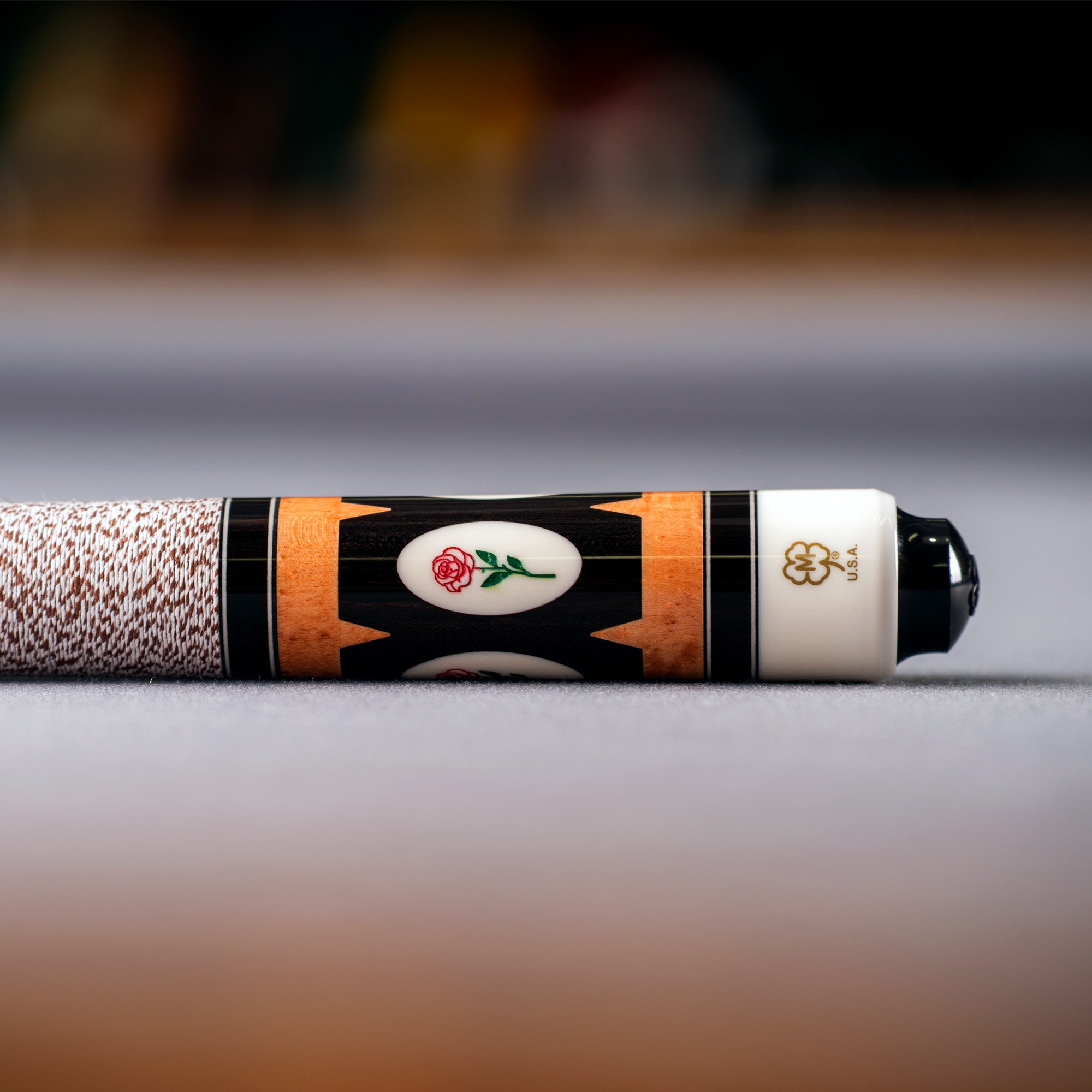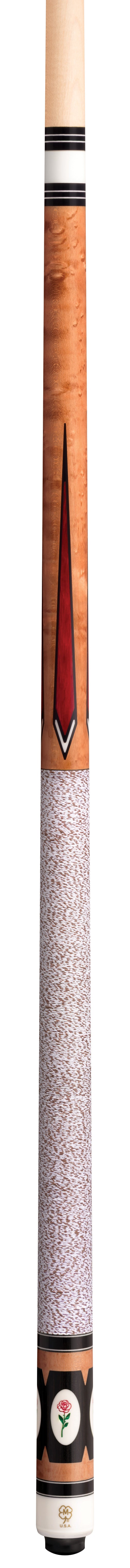 The MCD50K pays tribute to the D-23, one of the most beloved cues from the D-Series. Its signature rose motif returns through detailed laser engraving on the sleeve, framed by classic white oval inlays. While the inlay pattern remains true to the original, the floating points have been updated with bold red accents that echo the roses, creating a harmonious and modernized design. A light American cherry stain on the birdseye maple forearm and a traditional Irish linen wrap complete this elegant anniversary edition.
