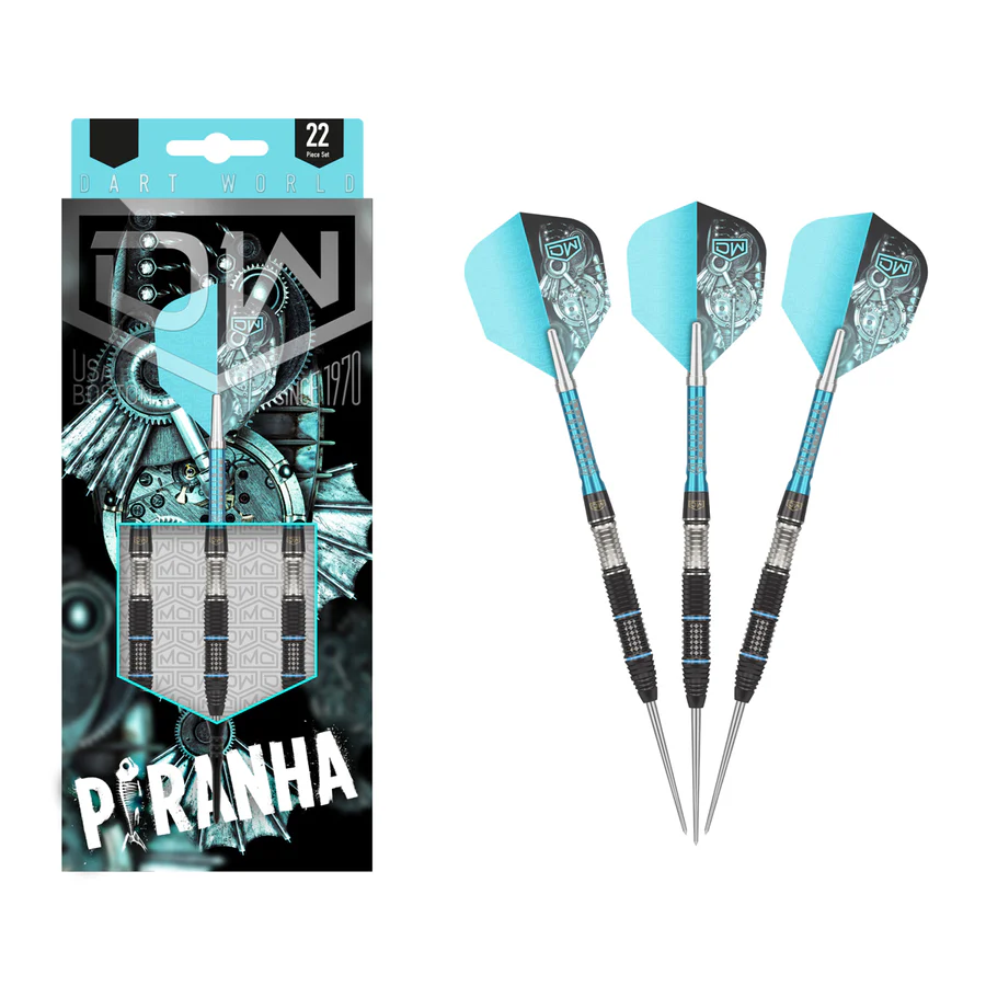 PIRANHA is a razor sharp range of 90% Tungsten steel and soft tip darts. With 2 barrel designs each of 3 steel tip and 2 soft weights, PIRANHA offers a variety of profiles for every skill level. Featuring multiple back cuts, mill cuts, and knurled grip zones this PVD Black Titanium Nitride coated barrel is enhanced by an exclusive 1.259” tapered steel point and the exclusive DW aluminum Top Spin shaft. Like its predecessor, this cutting-edge dart will be widely sought after for tournament and A-league play. PIRANHA- a premier dart for the serious player.